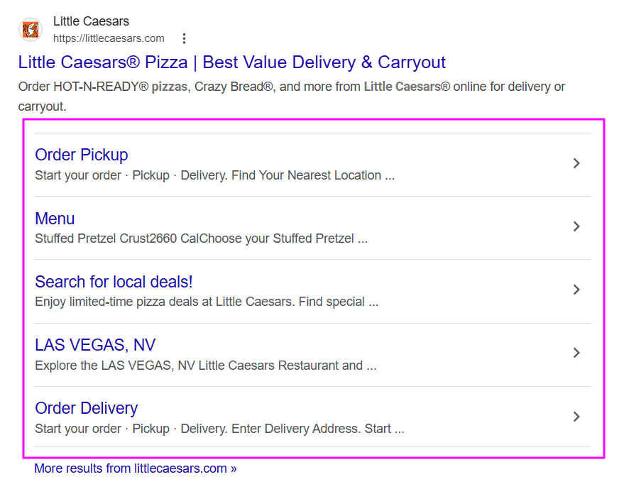 They include sitelinks to a page for ordering pickup and online, their menu, special local deals, and even one for a location near you.